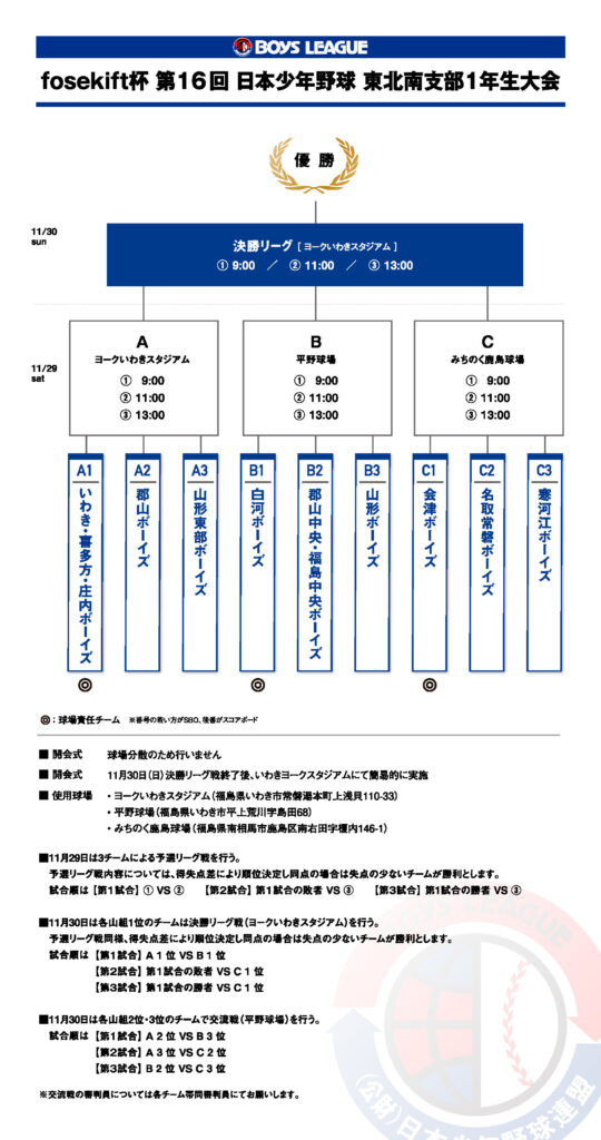 fosekift杯 第16回 日本少年野球 東北南支部 1年生大会 組合せ 大会情報2025年11月6日 4:15 PM | この記事へのリンク 11月29日、30日に開催される「fosekift杯 第16回 日本少年野球 東北南支部 1年生大会」の組み合わせが決まりましたので掲載します。 組み合わせは以下の通りです。