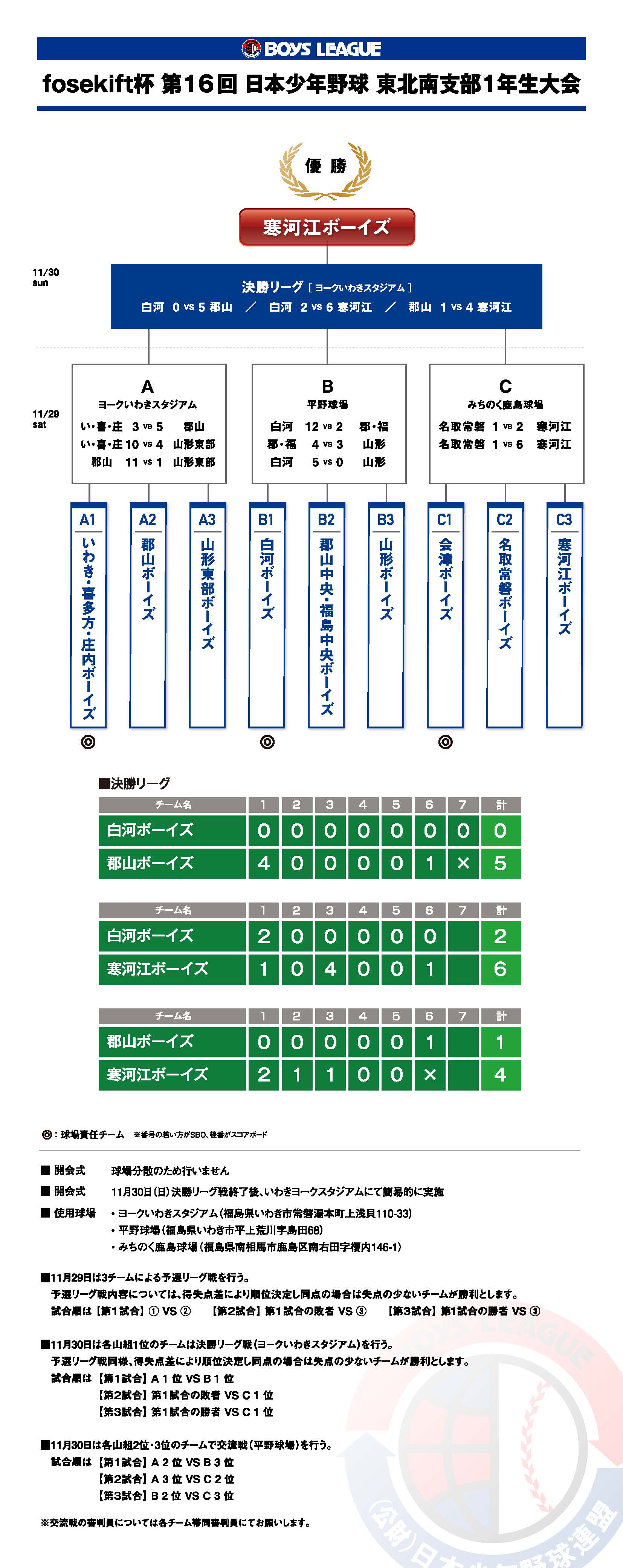 fosekift杯 第16回 日本少年野球 東北南支部 1年生大会 結果 大会情報2025年12月2日 12:19 PM | この記事へのリンク 11月29日、30日に「fosekift杯 第16回 日本少年野球 東北南支部 1年生大会」が開催されました。 試合結果は以下の通りです。 優勝 寒河江ボーイズ 準優勝 郡山ボーイズ 3位 白河ボーイズ