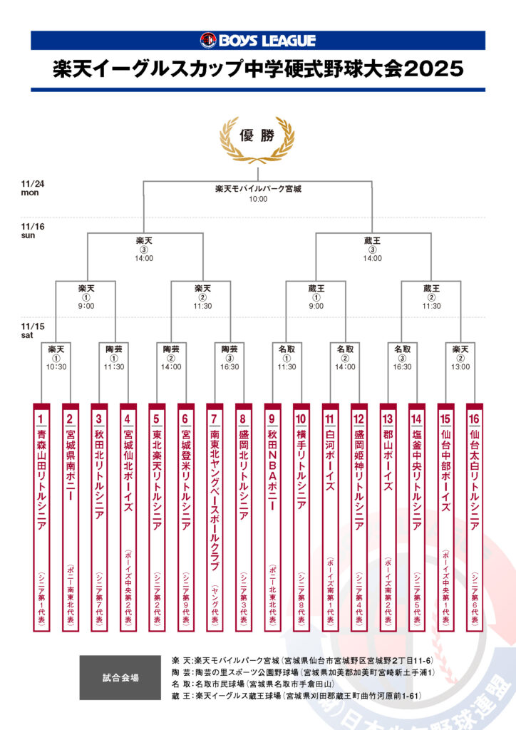 楽天イーグルスカップ中学硬式野球大会2025 組合せ 大会情報2025年11月8日 7:37 AM | この記事へのリンク 11月15日・16日・24日に開催される「楽天イーグルスカップ中学硬式野球大会2025」の組合せが決まりましたので掲載いたします。 南支部からは、白河ボーイズと郡山ボーイズが出場します。 組合せは以下の通りです。